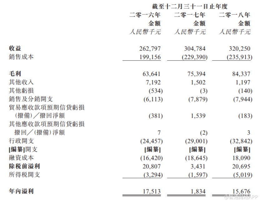 综合损益表显示,该集团截至2016年、2017年及2018年12月31日止年度,收益分别约为2.62亿元、3.04亿元及3.2亿元;毛利分别约为6364万元、7539万元及8433万元。