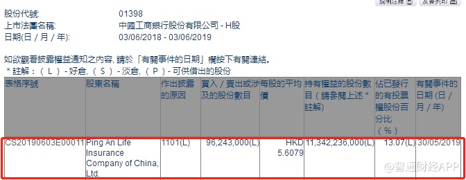 智通财经APP获悉,根据联交所资料显示,中国平安(02318)于5月30日增持工商银行(01398)9624万股,每股作价5.6港元,总值约5.4亿港元,最新持股数目约113亿股,最新持股比例为13.07%。