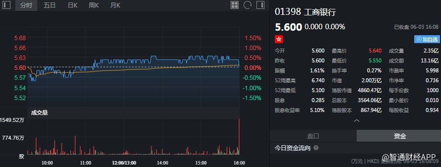 截至今日收盘,工商银行(01398)报5.6港元,与上一交易日相同。