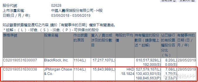 智通财经APP获悉,根据联交所资料显示,摩根大通于5月28日增持中国人寿(02628)1584万股,每股作价18.18港元,总值约2.88亿港元,最新持股数目约5.27亿股,最新持股比例为7.08%。