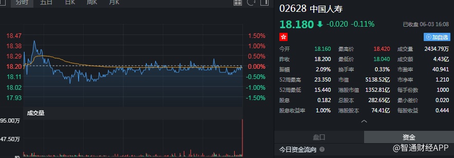 截至今日收盘,中国人寿(02628)跌0.11%,报18.18港元。