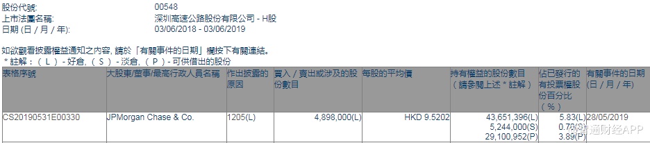 智通财经APP获悉,根据联交所资料显示,摩根大通于5月28日减持深圳高速公路(00548)489万股,每股作价9.52港元,总值约4655万港元,最新持股数目约4365万股,最新持股比例为5.83%。