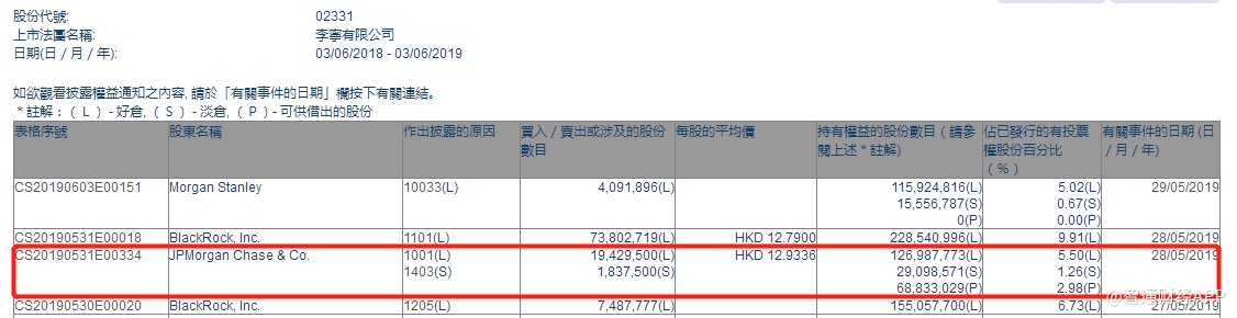 智通财经APP获悉,根据联交所资料显示,摩根大通于5月28日增持李宁(02331)1942万股,每股作价12.9港元,总值约2.51亿港元,最新持股数目约1.26亿股,最新持股比例为5.50%。