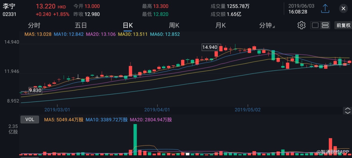 截至今日收盘,李宁(02331)涨1.85%,报13.22港元。