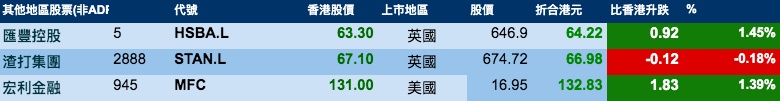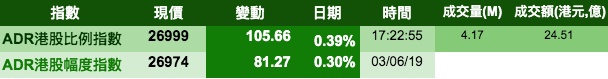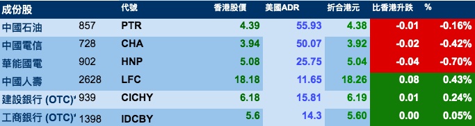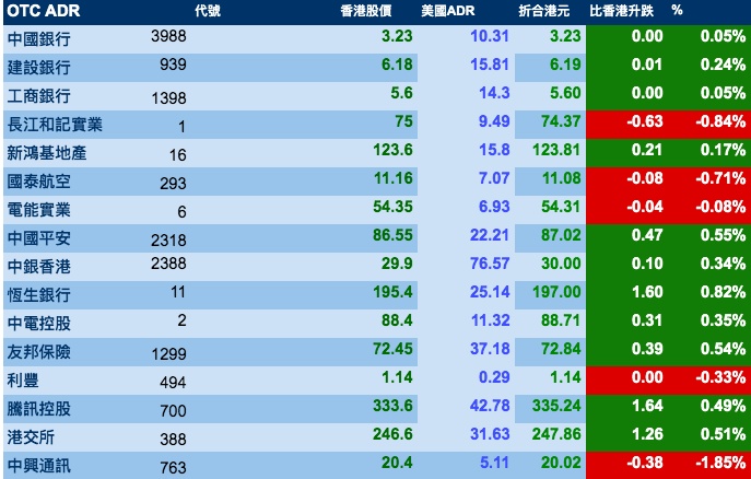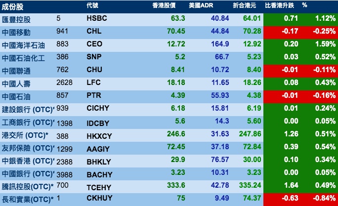 智通财经APP获悉,美股纳指受重挫,然而港股ADR指数全日靠稳,按比例计算,收报26999点,升105.66点。大型蓝筹全线向好,汇丰控股收报64.01元,较港收市升0.71元;腾讯控股收报335.24元,较港收市升1.64元。