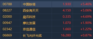 智通财经APP获悉,5G概念股行情持续,且午后涨幅扩大,截至发稿,中国铁塔(00788)涨5.46%,西安海天天(08227)涨5.06%,晨讯科技(02000)涨4.69%。