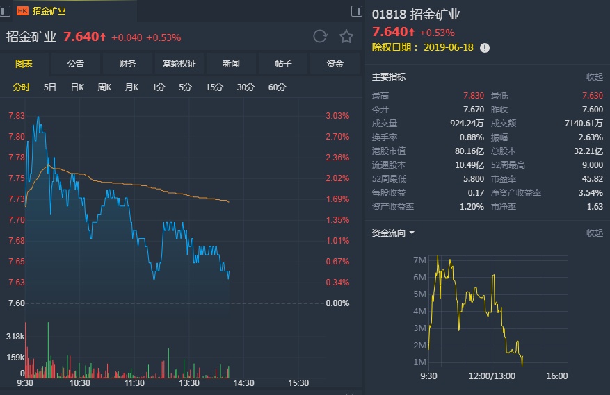智通财经APP获悉,摩根士丹利发表技术意见报告,称相信招金矿业(01818)于未来15天股价将上升,发生此概率介于70%至80%,予其“增持”投资评级,及目标价8.3港元。