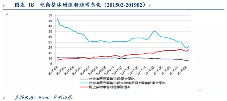 网购实物零售额持续保持高于社零的增速,但2016年起,电商行业整体增速换档,从爆发式增长转为常态化增长,维持在20%-30%左右增速区间。