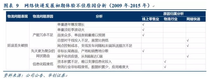 我们划分了9个因素中,其中4个因素属于线上零售业本身特质、2个因素属于物流行业快速发展期面临的共同难题,仅3个因素属于网络快递自身经营管理问题。