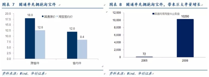 以圆通为例:2005年成为第一家与淘宝签约的国内快递企业,将快递价格砍掉1/3。2005-2008年,圆通网络的淘宝日均件量从2000件暴增到28万件,年均件量72万件从1.02亿件,2008年淘宝件占圆通件量47%,从而使得圆通市场份额达18%,成功崛起。