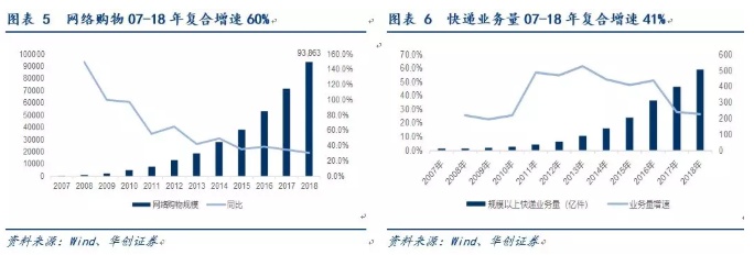 2003年,淘宝网成立,标志电商件业态开启。中国网络购物GMV从2007年的520亿,到2018年的9.4万亿,复合增速60%。受此驱动,07-18年快递业务量从12亿件上升至507亿件,复合增速41%,快递行业的主导从商务件转变为电商件。