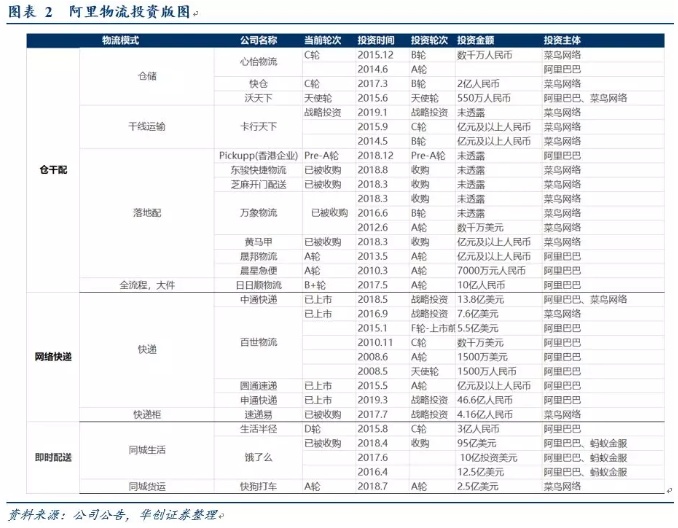 卡行天下:菜鸟分别于2014年5月、2015年9月、2019年1月,参与了B轮融资(亿元及以上人民币)、C轮、战略投资,卡行天下主要为公路运输平台,与电商物流交集主要为干线运输。