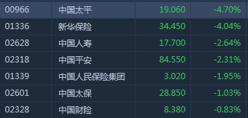 智通财经APP获悉,午后内险股随A股集体走弱。截至14时59分,中国太平(00966)跌4.7%,报价19.06港元,新华保险(01336)跌4.04%,中国人寿(02628)跌2.64%,中国平安(02318)跌2.31%,中国太保(02601)跌1.03%。
