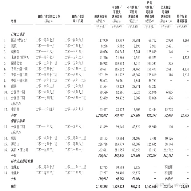 下表载列于2019年4月30日万创国际(i)已竣工物业;(ii)开发中物业;及(iii)持作未来开发物业的概要。其中,持作未来开发物业的总建筑面积为119992平方米,占所有总建筑面积的5.61%。