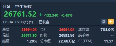 截至收盘,恒生指数跌132.34点或0.49%,报26761.52点,全日成交额达783.08亿。国企指数跌0.86%,报10341.12点,红筹指数跌1.15%,报4264.78点。