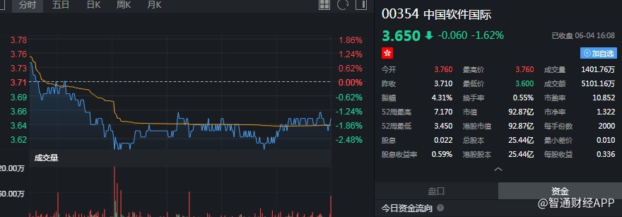 截至今日收盘,中国软件国际(00354)跌1.62%,报3.65港元。