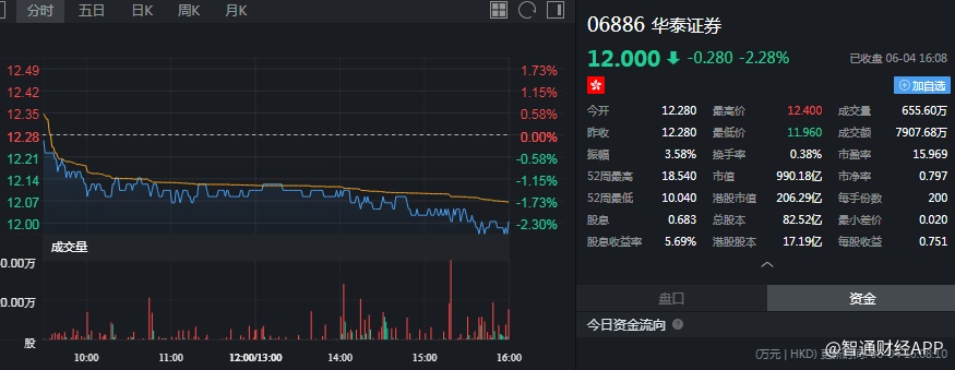 截至今日收盘,华泰证券(06886)跌2.28%,报12港元。