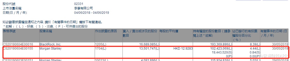 智通财经APP获悉,根据联交所资料显示,摩根士丹利于5月30日减持李宁(02331)1350万股,每股作价12.93港元,总值约1.75亿港元,最新持股数目约1.02亿股,最新持股比例为4.44%。