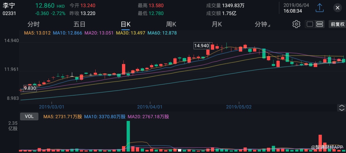 截至今日收盘,李宁(02331)跌2.72%,报12.86港元。
