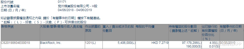 智通财经APP获悉,根据联交所资料显示,贝莱德于5月30日减持兖州煤业(01171)540万股,每股作价7.27港元,总值约3926万港元,最新持股数目约9718万股,最新持股比例为4.98%。