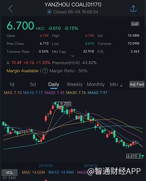 截至今日收盘,兖州煤业(01171)跌0.15%,报6.7港元。