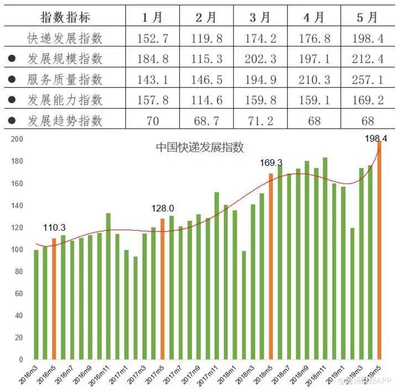 智通财经APP获悉,据国家邮政局昨日发布的数据显示,经测算,2019年5月中国快递发展指数为198.4,同比提高17%,呈现稳中向好的态势。发展规模指数、服务质量指数和发展能力指数分别为212.4、257.1和169.2,分别比上年同期提高了24.2%、10.6%和23.8%。发展趋势指数为68,与上期持平,保持相对稳定。