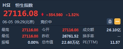 智通财经APP获悉,恒生指数开盘涨354.56点或1.32%,报27116.08点。国企指数涨1.13%,报10457.63点。红筹指数涨0.66%,报4292.96点。大市盘前成交26.1亿港元。隔夜美股三大指数涨幅均超2%,创1月4日以来最大单日涨幅,道指收涨逾500点,科技股集体收涨。