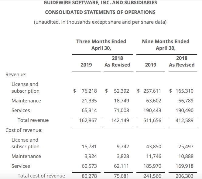 智通财经APP获悉,美国软件公司Guidewire Software(GWRE.US)于6月4日美股盘后发布2019财年第三季度业绩报告。截至4月30日至3个月,公司实现总收入1.62亿美元,较上一财年同期1.42亿美元增长14.08%;毛利8258万美元,同比增24.2%,毛利率从上一财年同期的46.76%上升至50.71%;净亏损858万美元,同比收窄72.46;摊薄每股亏损11美分,经调整,每股收益为18美分,超出分析师预计的8美分。