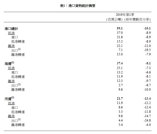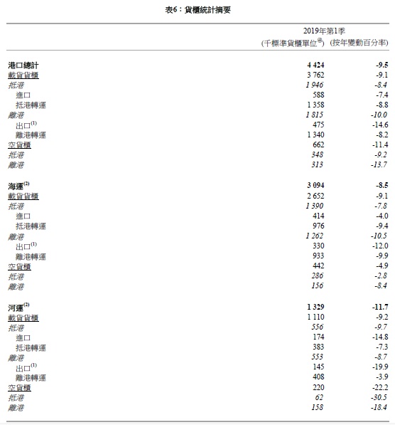2019年第一季的海运及河运载货货柜较2018年第一季分别下跌9.1%及9.2%,为265万标准货柜单位及111万标准货柜单位。