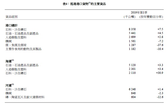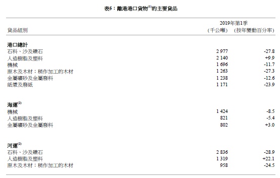 2019年第一季与2018年第一季比较,抵港港口货物中,重量录得双位数字跌幅的主要货品为“煤、焦煤及煤球”(跌37.6%)和“主要作食用的动物及其制品”(跌10.4%)。在离港港口货物中,重量录得双位数字跌幅的主要货品为“石料、沙及砾石”(跌27.8%)、“原木及木材;稍作加工的木材”(跌27.3%)、“纸浆及废纸”(跌23.9%)、“金属矿砂及金属废料”(跌12.6%)和“机械”(跌11.7%)。