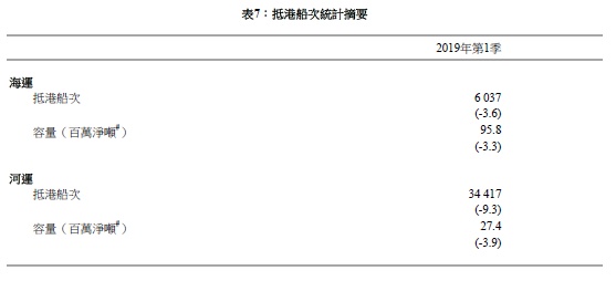 2019年第一季与2018年第一季比较,抵港远洋轮船船次下跌3.6%,为6037船次,其总容量亦下跌3.3%,为9580万净吨。同时,抵港内河船船次下跌9.3%,为34417船次,总容量亦下跌3.9%,为2740万净吨。
