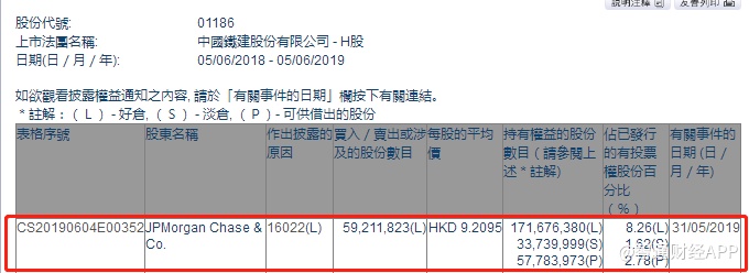 智通财经APP获悉,根据联交所资料显示,摩根大通于5月31日减持中国铁建(01186)5921万股,每股作价9.2港元,总值约5.45亿港元,最新持股数目约1.71亿股,最新持股比例为8.26%。