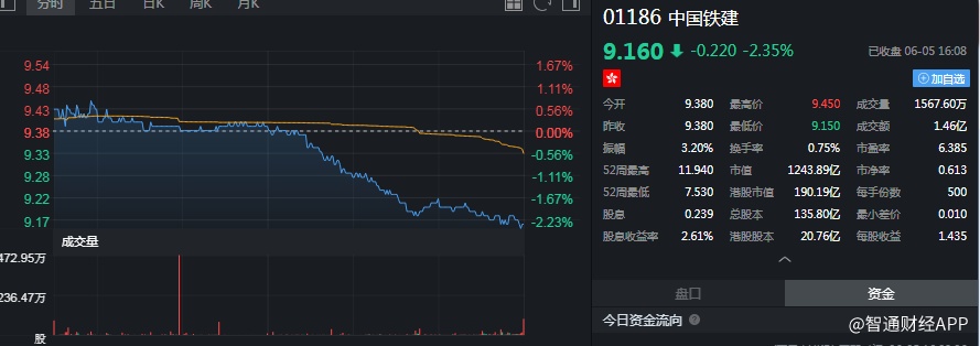 截至今日收盘,中国铁建(01186)跌2.35%,报9.16港元。