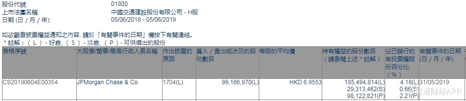 智通财经APP获悉,根据联交所资料显示,摩根大通于5月31日减持中国交通建设(01800)9916万股,每股作价6.96港元,总值约6.9亿港元,最新持股数目约1.85亿股,最新持股比例为4.18%。