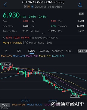 截至今日收盘,中国交通建设(01800)跌0.43%,报6.93港元。