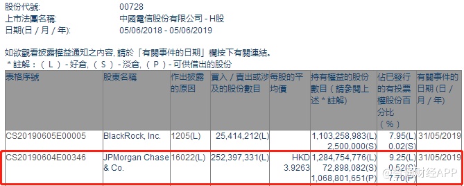 智通财经APP获悉,根据联交所资料显示,摩根大通于5月31日减持中国电信(00728)2.52亿股,每股作价3.9港元,总值约9.8亿港元,最新持股数目约12.84亿股,最新持股比例为9.25%。
