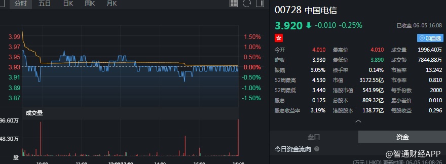 截至今日收盘,中国电信(00728)跌0.25%,报3.92港元。