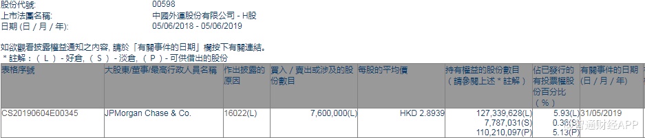 智通财经APP获悉,根据联交所资料显示,摩根大通于5月31日减持中国外运(00598)760万股,每股作价2.89港元,总值约2196万港元,最新持股数目约1.27亿股,最新持股比例为5.93%。