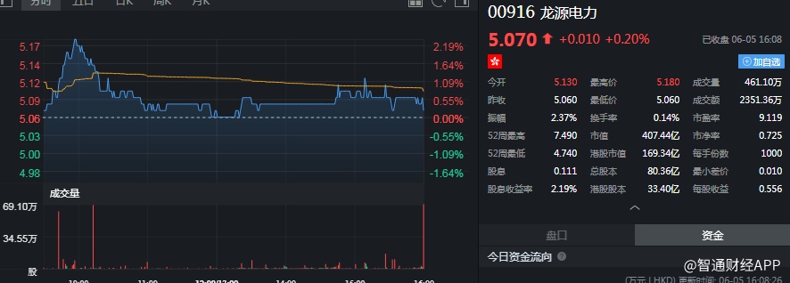 截至今日收盘,龙源电力(00916)涨0.2%,报5.07港元。