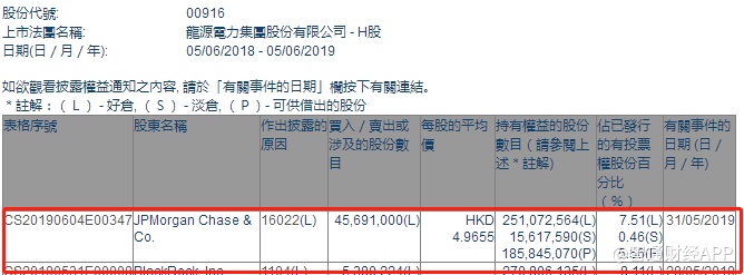 智通财经APP获悉,根据联交所资料显示,摩根大通于5月31日减持龙源电力(00916)4569万股,每股作价4.96港元,总值约2.27亿港元,最新持股数目约2.51亿股,最新持股比例为7.51%。