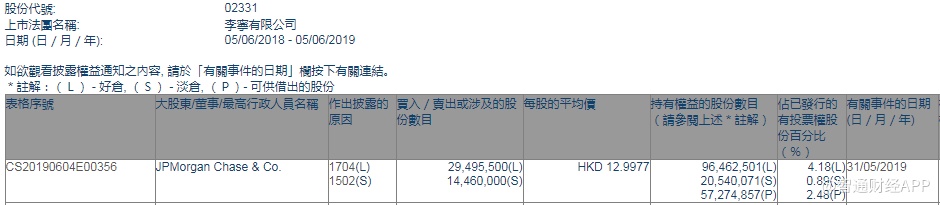 智通财经APP获悉,根据联交所资料显示,摩根大通于5月31日减持李宁(02331)2949万股,每股作价12.99港元,总值约3.83亿港元,最新持股数目约9646万股,最新持股比例为4.18%。