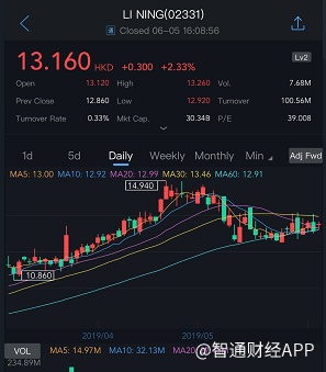 截至今日收盘,李宁(02331)涨2.33%,报13.16港元。