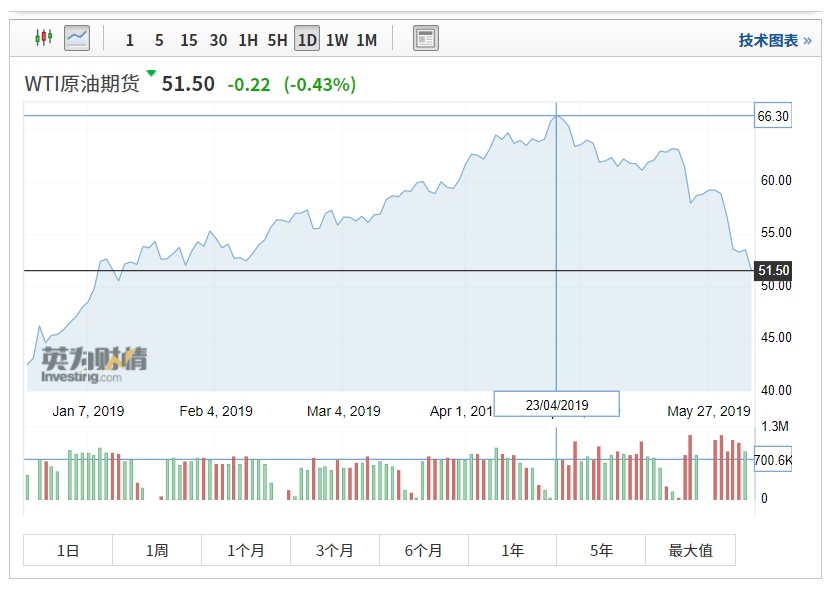 智通财经APP获悉,昨日(6月5日),布油、WTI原油价格均大跌,WTI 7月原油期货收跌1.80美元,跌幅3.37%,报51.68美元/桶,较4月23日高位回落22%。今日继续下跌,截止到发稿,跌0.43%,报51.50美元/桶。