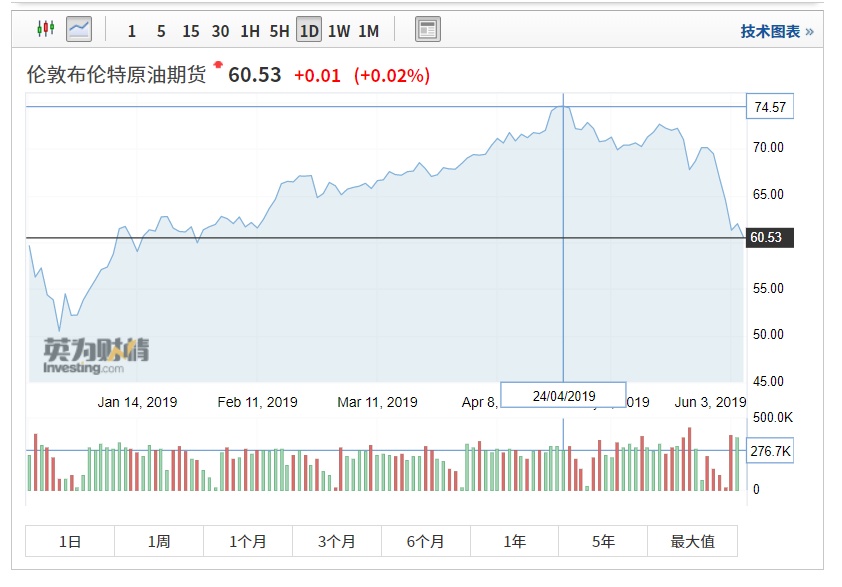 布伦特8月原油期货收跌1.34美元,跌幅2.20%,报60.63美元/桶,价格一度跌破60美元/桶,较4月24日高位回落19%。