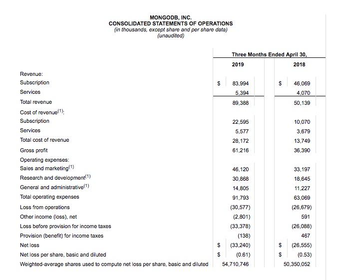 智通财经APP获悉,MongoDB, Inc.(MDB.US)于6月5日美股盘后公布2020财年第一季度的业绩报告。截至2019年4月30日止3个月,公司实现总收入8938万美元,较上一财年同期5013万美元增长78.3%;毛利6121万美元,同比增长68.21%;毛利率从上一财年的72.59%下降至68.48%;经营亏损3057万美元,同比扩大14.62%;净亏损3324万美元,同比扩大25.2%;每股亏损61美分,经调整后每股亏损22美分,胜于分析师预期。