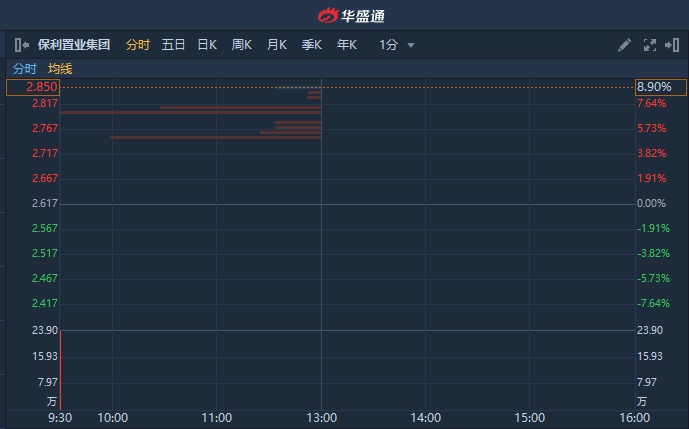 智通财经APP获悉,保利置业集团(00119)早盘跳空高开,截至9时20分,涨8.9%,报2.85港元,成交额达68.12万港元。