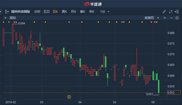 智通财经APP获悉,早盘走势平稳的绿科科技国际(00195)午后显著走弱,创下历史新低0.051港元,截至14时15分,跌10.34%,报0.052港元,成交额达13.89万港元。