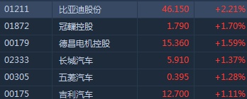 智通财经APP获悉,发改委发布推动汽车更新消费政策,此消息促进汽车板块整体上扬。截至15时27分,比亚迪(01211)涨2.21%,报价46.15港元,长城汽车(02333)涨1.37%,吉利汽车(00175)涨1.11%。