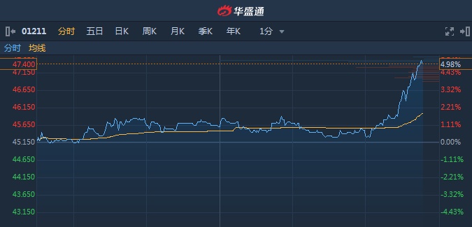 智通财经APP获悉,发改委发文要求,各地不得对新能源汽车实行限行、限购。此消息刺激比亚迪(01211)尾盘股价快速拉升。截至15时46分,涨4.98%,报价47.4港元,成交额4.492亿。