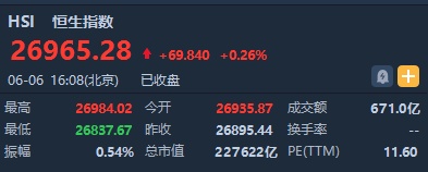 截至收盘,恒生指数涨69.84点或0.26%,报26965.28点,全日成交额达671.03亿。国企指数跌0.1%,报10334.32点,红筹指数涨0.18%,报4273.92点。